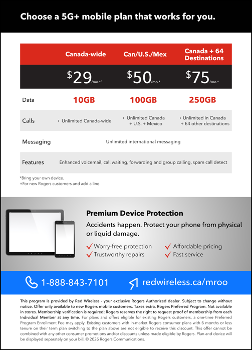 Visit: redwireless.ca/mroo or at call 1-888-843-7101.